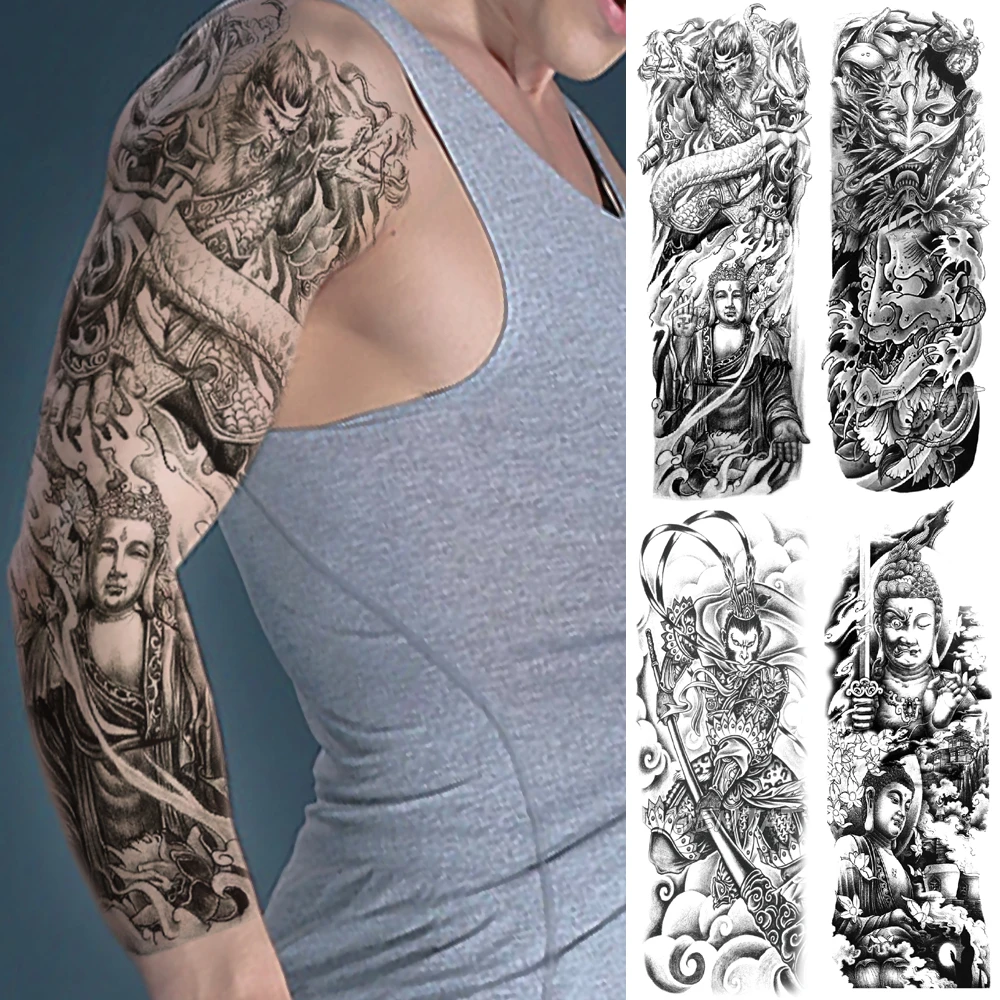 Grand Bras Manches Tatouage Dragon Bouddha Singe Roi Impermeable Temporaire Faux Tatoo Autocollant Crane Japonais Hommes Femmes Plein Tatto Aliexpress
