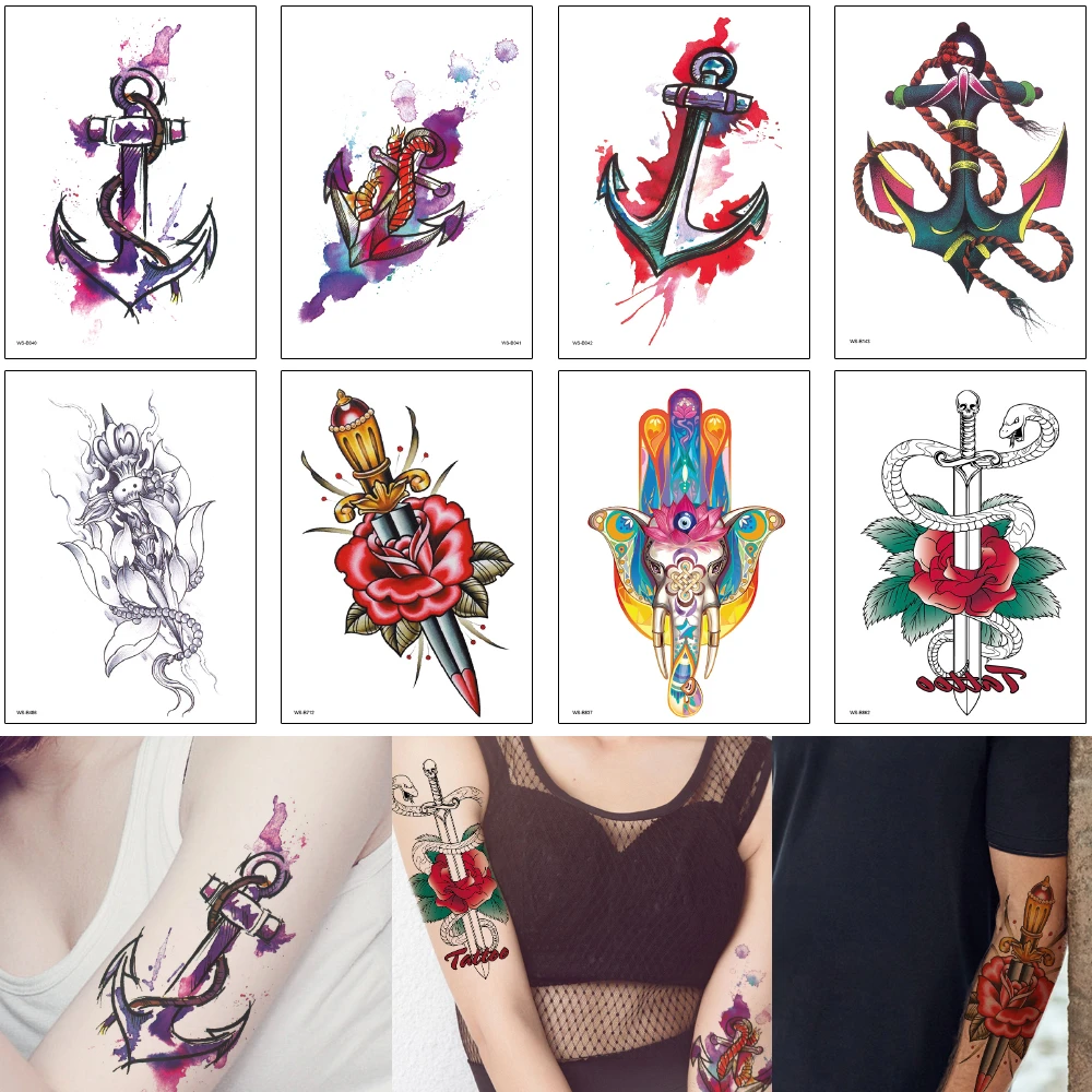 Impermeable Temporaire Tatouage Aquarelle Ancre Epee Crane Fleur Serpent Conception Faux Autocollant Femme Homme Corps Bras Dos Art Tatouages Aliexpress